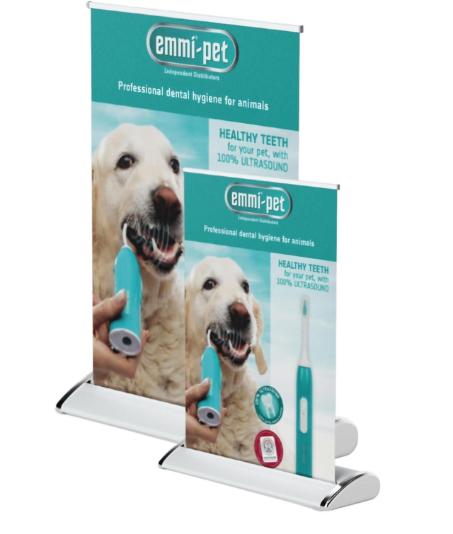 A5 Desk Top Roll Up Banner Mini. emmi-pet Logo and Golden Labrador/Mint Design