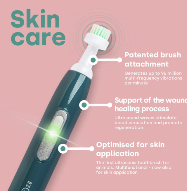 The patented ultrasound system from emmipet is ideally suited for daily wound care, skin and coat care for your pet.